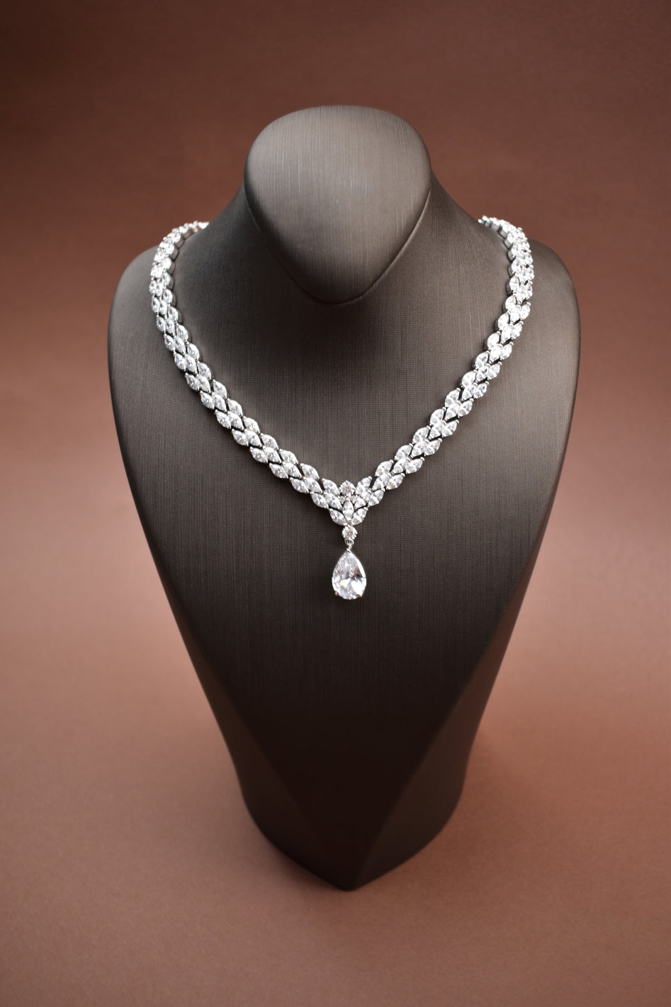 A modern wedding necklace stands out through its unique design and the ability to complement the bride's look. High-quality materials like Swarovski crystals or the highest quality simulated diamonds, coupled with innovative designs, make each necklace not just an accessory, but a centerpiece that enhances the bridal attire while reflecting the latest trends. It is always recommended to go check out our latest bridal necklace collection.