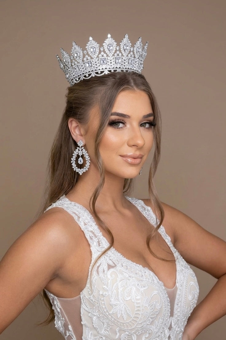 One of our Luxurious crowns, MAJESTIC ROYAL Crystal Full Crown with Simulated Diamonds and Premium High-Quality Crystals. This Wedding or Quinceanera Full Crown comes with Stunning Design and Gorgeous Crystals arrangements. It is Handcrafted with Brilliant Craftsmanship. MAJESTIC ROYAL is fit for a Royal Wedding or Event for the bride or quinceanera to feel like a queen.