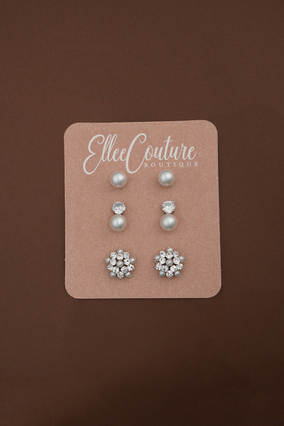 Our RIBBON Earring trio features a floral design made with a cluster of Pearls and Simulated Diamond crystals, and two daintier studs created to be the perfect size to add sparkle in your overall look. These dainty yet sophisticated earrings are amazing to wear as an everyday look and at a special occasion event.