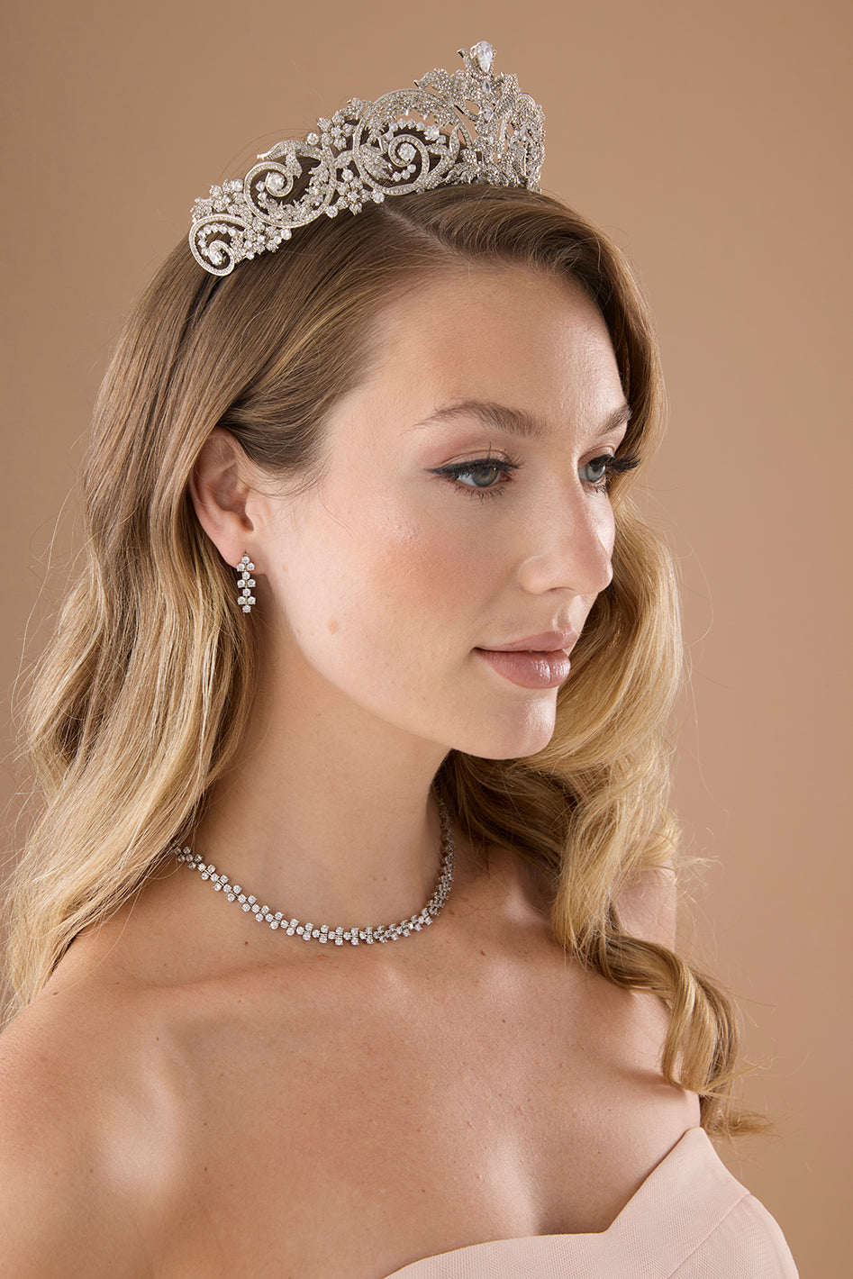 The intricate designs of our royal tiaras complement every neckline, from sweetheart to high collars, adding a layer of sophistication.